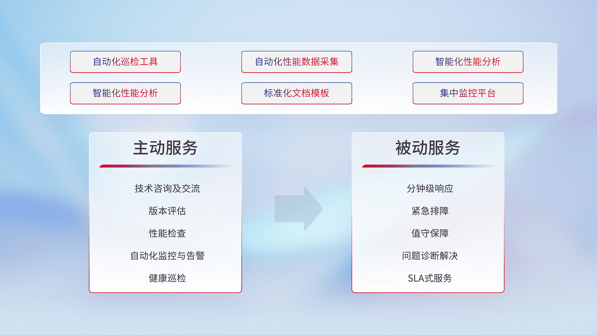 智能化工具和标准化文档,,保障服务质量,,,,提供主动服务(包含技术咨询、、、、版本评估、、性能检查、、、、自动化监控与告警、、、、健康巡检)和被动服务包含(分钟级响应、、、、紧急排障、、值守保障、、问题诊断解决、、、、SLA服务)。。。。